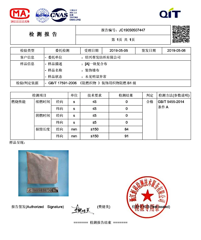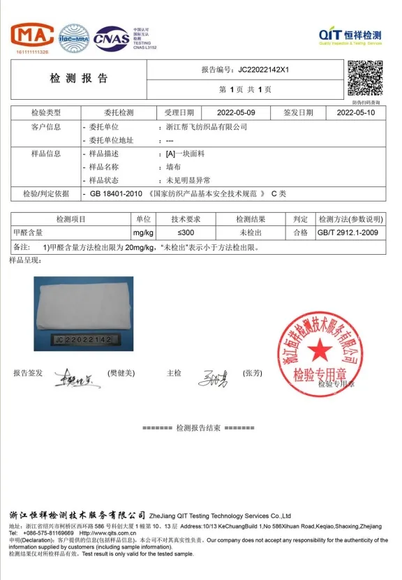 We adhere to strict standards and do our best to ensure the quality of our products. We ensure the quality of our products acording to strict quality standards and inspection methods. Our quality testing includes raw materials, yarn,Weaving, dyeing,compounding, and other process, besides, all products must meet with the industry’s standard of error. Before sending the products, there will be a special quality control personnel to check all the products to ensure the quality. Quality is the core competitiveness of the continuous development of the enterprise. Bangfa always devotes itself to our production concept-“Quality is our Culture”. Therefore, we strictly require the performance of the products. It is very important for the textile product to be safe, comfortable, environmentally friendly and durable,the performance of water proof, Flame retardant,mould proof,formaldehyde-free and no odor promoted through the inspection of a professional organization qualified. We can bring quality assured products to the clients, and everyone form Bangfa is pround of it.